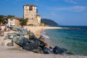 Chalkidiki, eine Halbinsel auf dem Festland von Griechenland war 2025 eines von mehreren Reisezielen des Schwimmvereins Bamberg. Wie immer perfekt organisiert von Traudl Hartmann, diesmal tatkräftig unterstützt von Nikos, einem hiesigen Busfahrer, der den Schwimmverein schon etliche Male zu verschiedenen Zielen gefahren hat. Nikos ist gebürtiger Grieche aus Néa Róda einem kleinen Ort auf Áthos, einem der drei Finger Chalkidikis. Nicht nur diesen Ort zeigte uns Nikos, sondern er führte die Schwimmvereinler u.a. nach Arnéa, mit seinem gut erhaltenen Häusern aus dem 18. und 19. Jahrhundert, und nach Stagira dem Geburtsort von Aristoteles. Auf einer Schifffahrt entlang der Küste von Athos erhielten die Teilnehmer eine Reihe interessanter Informationen zum Leben in der Mönchsrepublik.